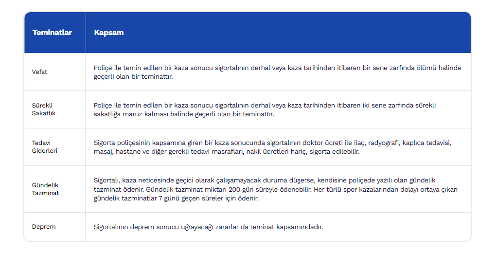 ✅ Tedavi Masraflarının Karşılanması: Kaza nedeniyle hastaneye yatış, ameliyat ve diğer tedavi masraflarınız sigorta kapsamında karşılanabilir.